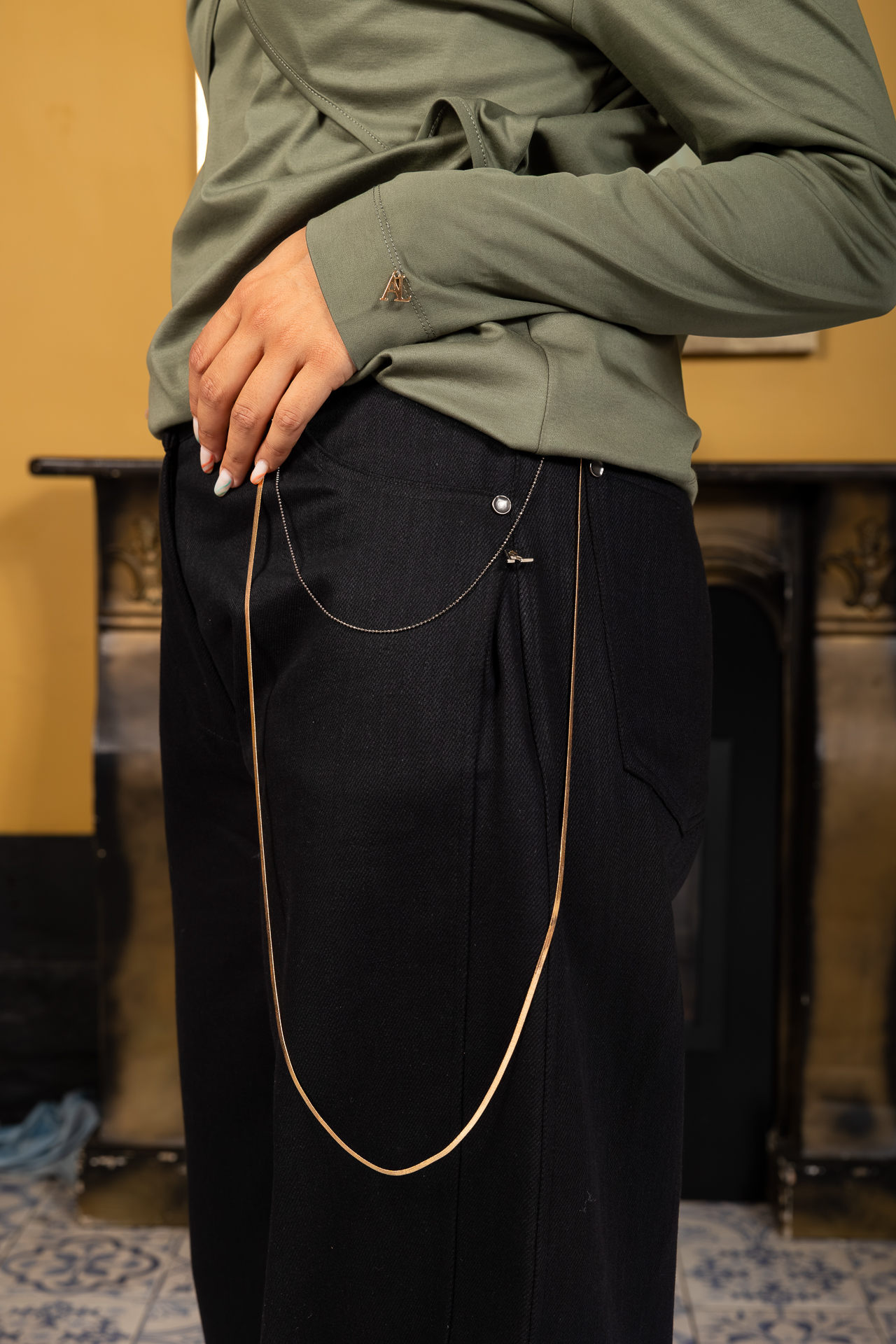 As correntes, juntamente com a personalização dourada, criam um visual único e moderno.