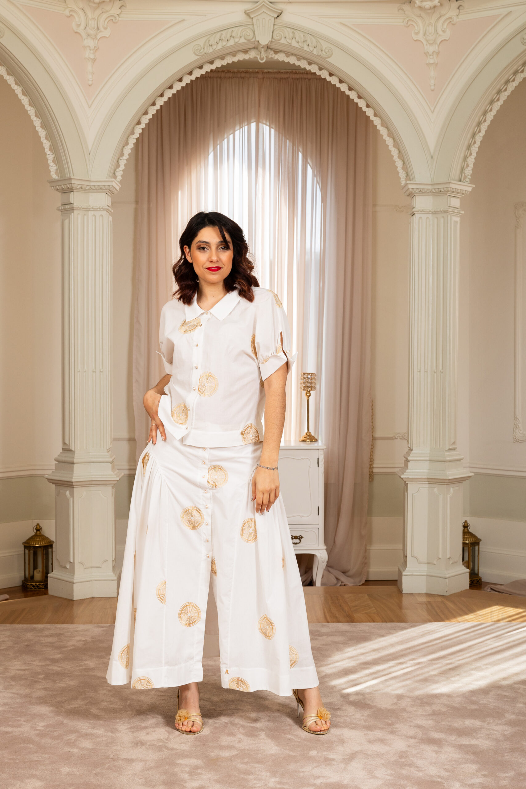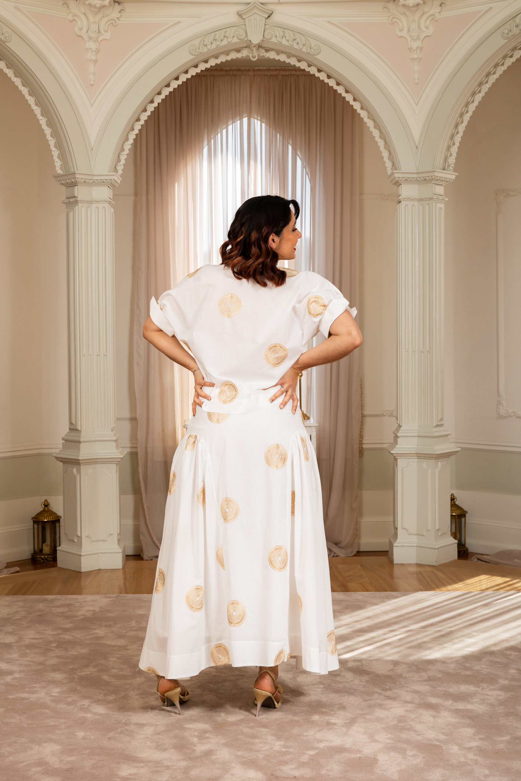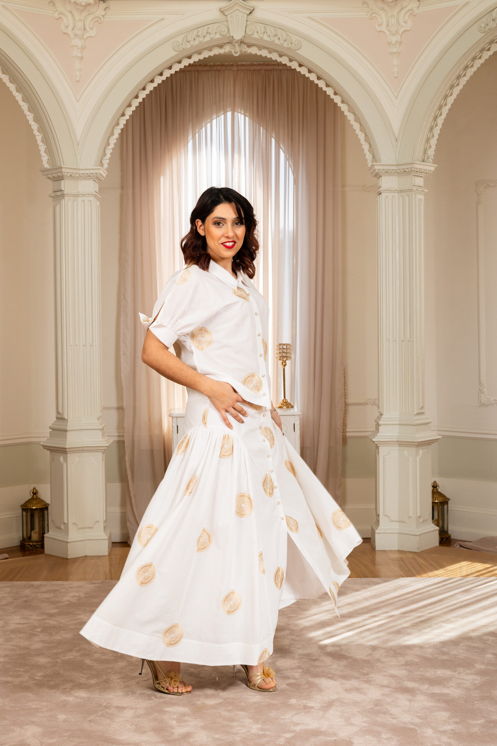 Saia longa com luxuoso bordado a ouro all over. Aperta na frente com botões dourados e pérolas