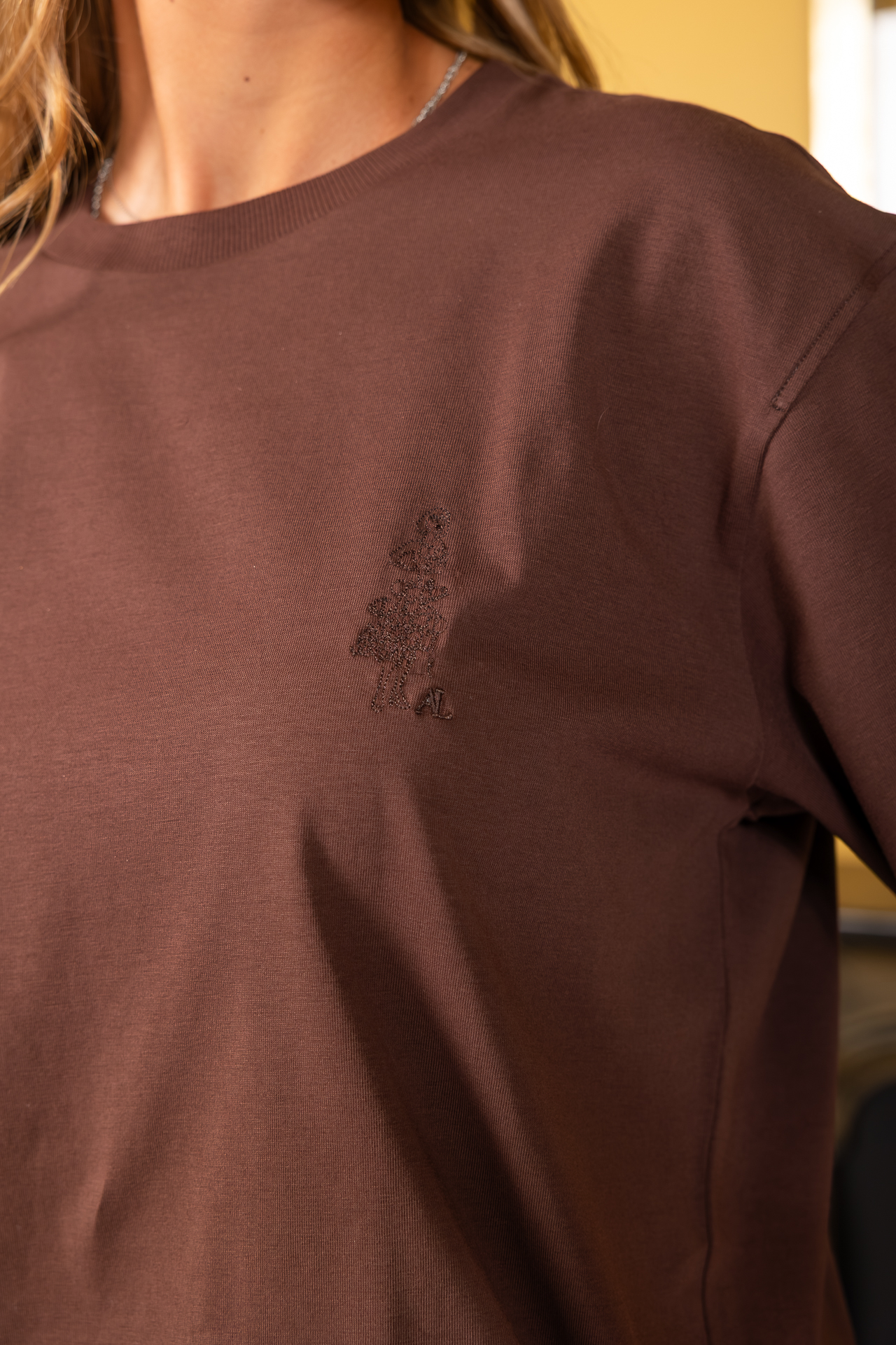 T-shirt com boneca AL bordada. Ideal para qualquer look.