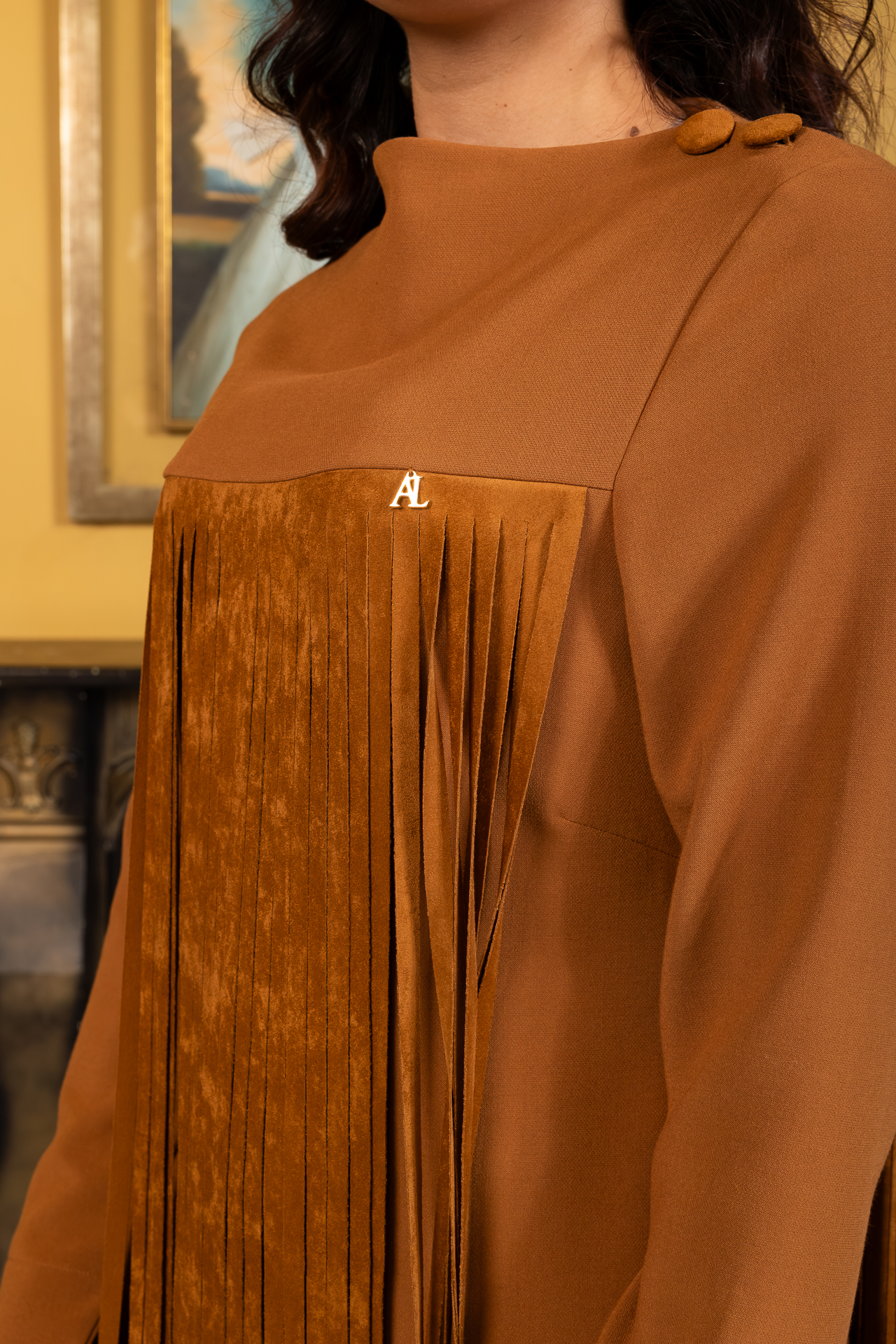 Com um toque boémio e sofisticado, este vestido curto em efeito camurça destaca-se pelas franjas que acrescentam fluidez e personalidade ao look.