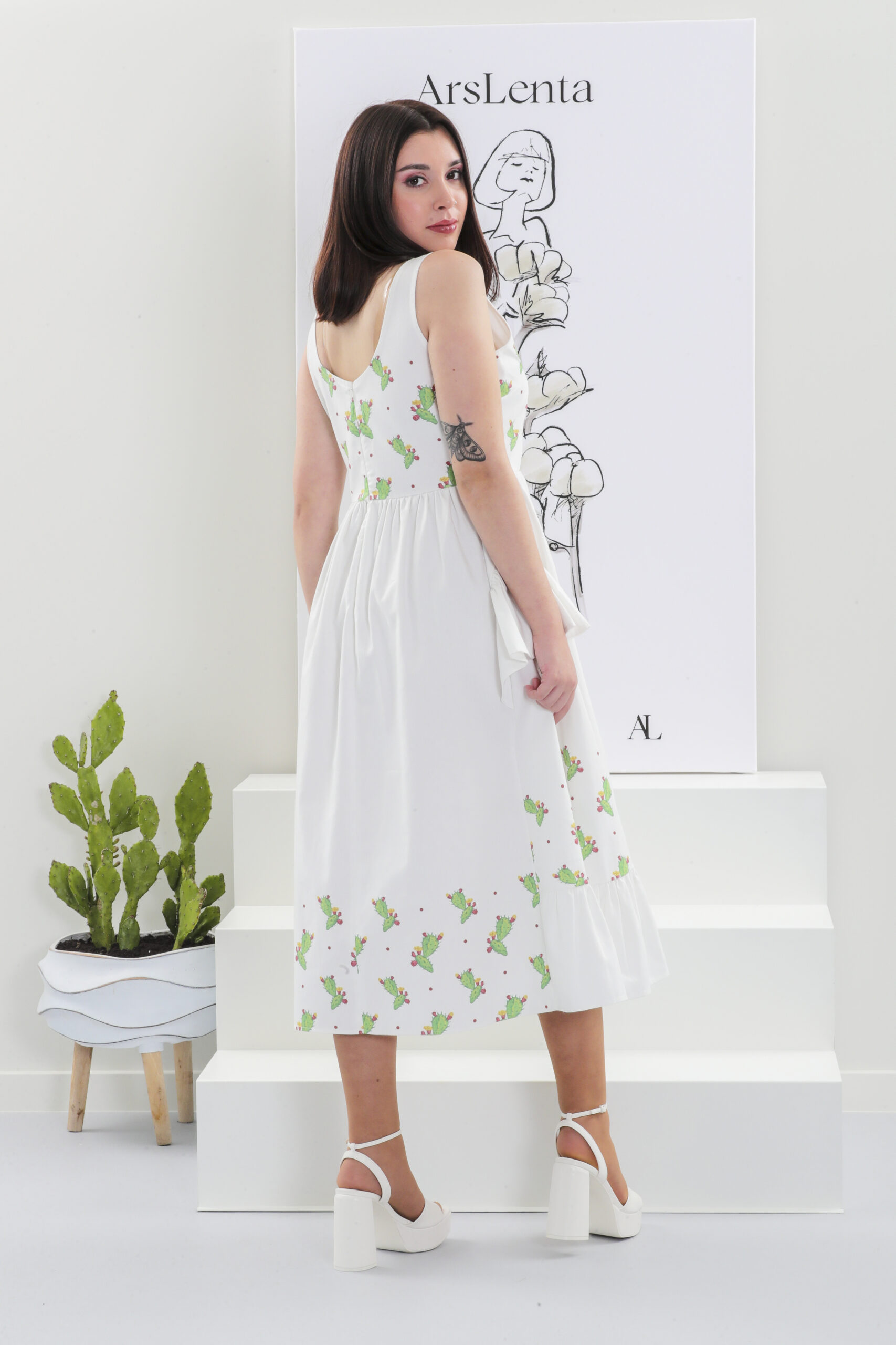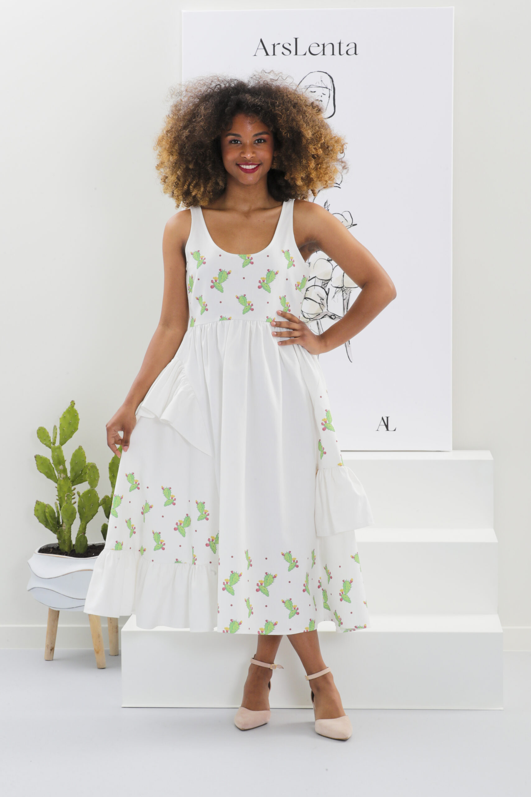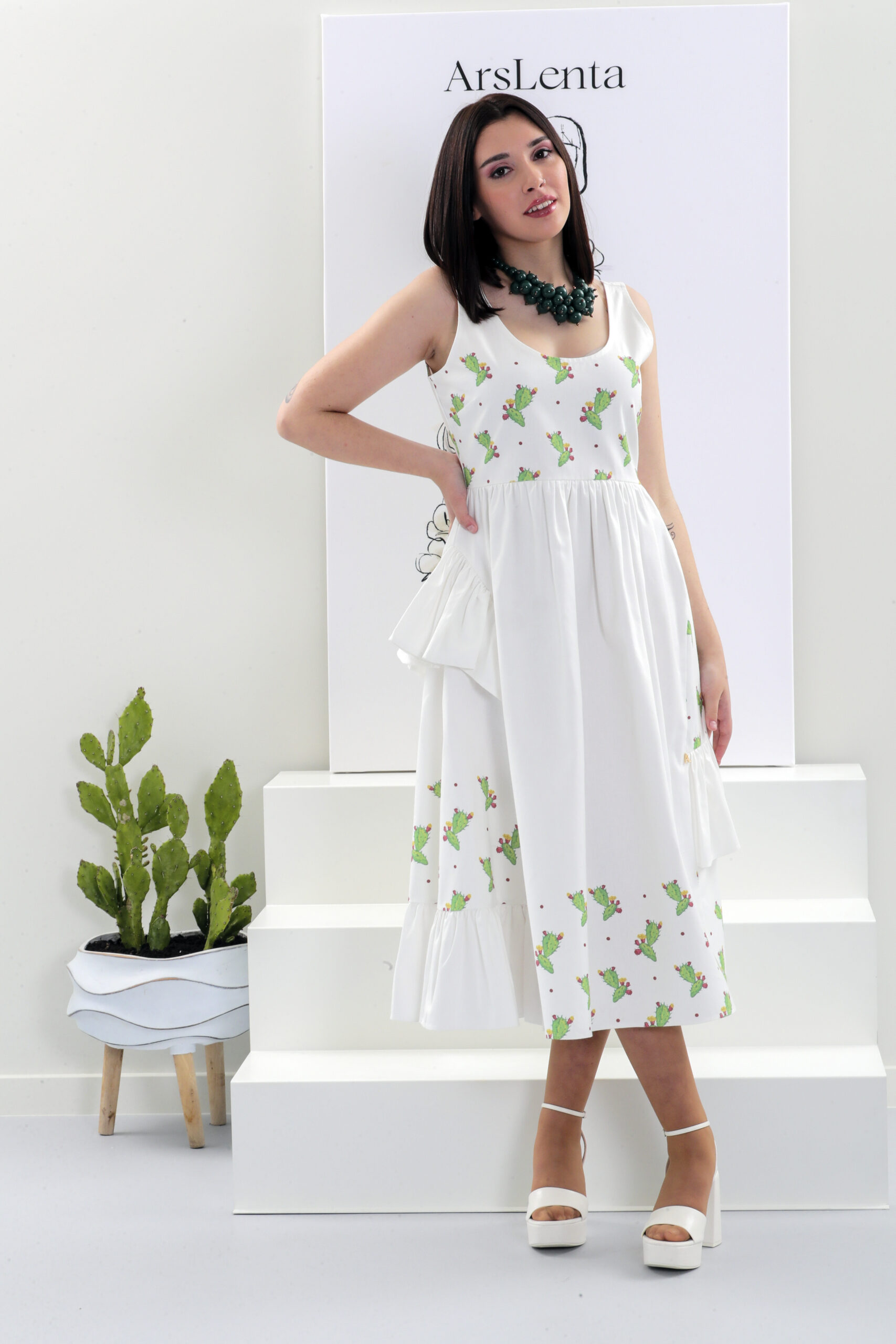 Vestido longo com folhos com estampado com catos.